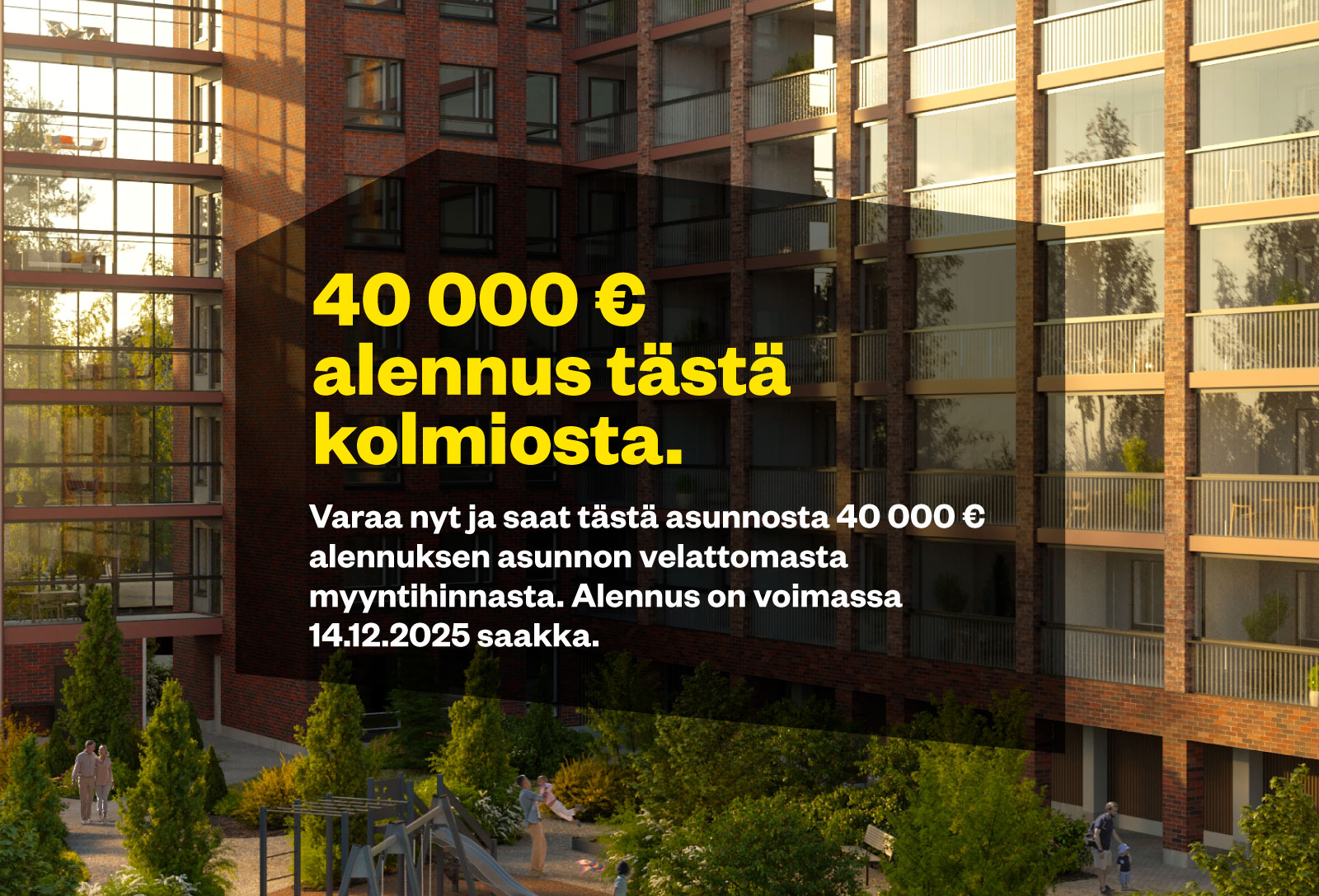 Varaa nyt, ja saat 40 000 euroa alennusta asunnon velattomasta myyntihinnasta. Alennus koskee asuntoja A06, A12, A18 ja A24, ja on voimassa 14.12.2025 saakka. Oikeudet muutoksiin pidätetään.