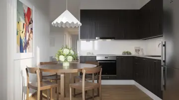 Keittiökalusteiden ovet ja etusarjat ovat Novartin vakiomallistoa ja kodinkoneet Electroluxin valikoimasta. Materiaalit Sisustusvalinnat-esitteen tyylien mukaisesti. Lattioiden, seinien ja kattojen pinnat olohuoneen mukaisesti.