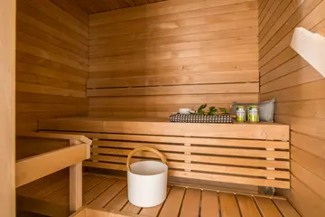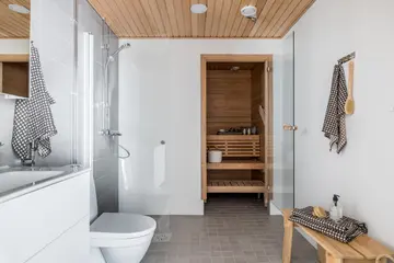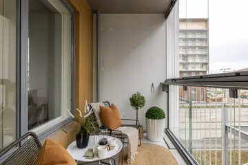 Sisäpihan tasolla, toisessa kerroksessa, sijaitseva kulmahuoneisto, jossa on erittäin toimiva pohjaratkaisu. Luksusta arkeen tuovat oma sauna ja iso lasitettu terassi, jonka maisemat ovat rauhalliselle sisäpihalle ja joka toimii lisähuoneena lämpiminä päivinä. Erillinen keittiö mahdollistaa ruuanlaitolle ja ruokailulle oman rauhallisen tilan. Huoneiston ikkunoiden maisemat avautuvat sekä Merituulentielle että sisäpihalle.