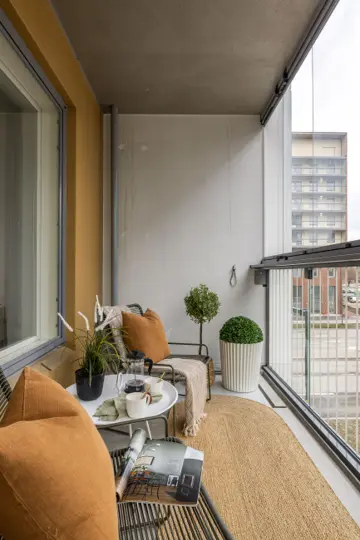 Huoneistoilla on ulko-oleskelutilat pohjapiirustusten mukaisesti. Lattia ja katto ovat betonia. Lattiassa on asunnon varatieluukku ja katossa on ylemmän asunnon varatieluukku. Lattian päälle asennetaan parvekematto. Parvekekaiteet ovat metallirunkoisia lasikaiteita. Asuntoparvekkeet on lasitettu. Parvekkeet ovat ulkotiloja. Parvekekaiteet ja -lasitukset eivät ole tiiviitä ja niiden raoista voi tulla sadevettä tai lunta parvekkeelle. Parvekkeiden lattioihin on asennettu varatieluukku.
