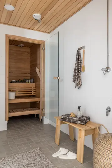 Lattiat ovat laatoitettu Laattapisteen 10x10 cm laatalla. Seinät ovat laatoitettu valkoisella kiiltävällä tai mattapintaisella laatalla Sisustusvalinnat-esitteen tyylien mukaisesti. Katto on tervaleppää. Märkätilojen allaskalusteet ja peilikaapit ovat Svedbergin valikoimasta. Hanat ja suihkut ovat Oraksen - ja wc-istuin Gustavsbergin valikoimasta. Osassa asunnoista on erillinen wc.