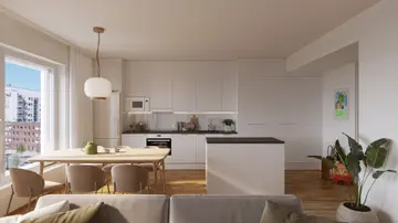 Keittiökalusteiden ovet ja etusarjat ovat Novartin vakiomallistoa ja kodinkoneet Electroluxin valikoimasta. Materiaalit Sisustusvalinnat-esitteen tyylien mukaisesti. Lattioiden, seinien ja kattojen pinnat olohuoneen mukaisesti.