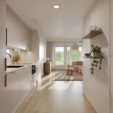 Tämä 44,5 m² kaksio tarjoaa tilaa ja toimivuutta kompaktissa paketissa. Keittiö ja oleskelutila yhdistyvät saumattomasti luoden tilan, joka on helppo sisustaa omien tarpeiden mukaan. Näkymät itään tuovat aamuauringon säteet kauniisti sisään ja Huoneiston levyinen parveke toimii täydellisenä paikkana rentoutua.