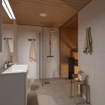 Kylpyhuoneessa on lattiassa ja seinässä keraaminen laatta sekä paneloitu tervaleppäkatto. Kylpyhuoneessa on allas, allaskaappi, peilikaappi. Kylpyhuoneissa on suihkuseinä tai suhkunurkkaus pohjakuvan mukaisesti.
