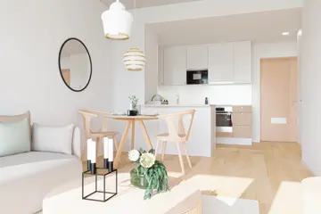 Kompaktin kaksion jokainen neliö on tarkkaan harkittu. Valoisa avokeittiö-olohuone tarjoaa oleskelu- ja seurustelutilaa, kun taas parvekkeella nautit aamuauringosta kahvikupillisen kera.