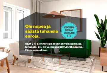 Nappaa rahanarvoinen etu ja säästä tuhansia euroja! Saat 3% alennusta asunnon velattomasta hinnasta. Alennus tarkoittaa isoa säästöä, kuten esimerkiksi: