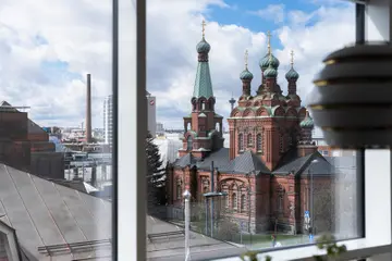 Tämän kulmahuoneiston ikkunoista avautuu upeat näkymät kauniille ortodoksiselle kirkolle ja sen katolla kohoaviin kupoleihin. Lisäksi voit ihailla maisemia Ratinan suuntaan. Tämän kaksion lattiasta kattoon ulottuvat ikkunat valaisevat asunnon kauniisti ja luovat avaran tunnelman. Asuntoon kuuluu oma sauna ja vaatehuone, jotka tuovat lisämukavuutta asumiseen.
