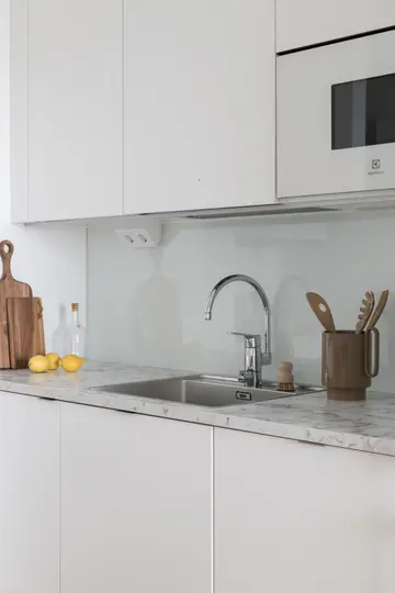 Kylpyhuoneen laatat ovat Laattapisteen Neutro-mallistoa sisustustyylien mukaisesti. Kylpyhuoneen seinät ovat valkoista matta- tai kiiltävää laattaa. Kalusteet ovat Laattapisteeltä. Katto on valkolakattua puupaneelia.