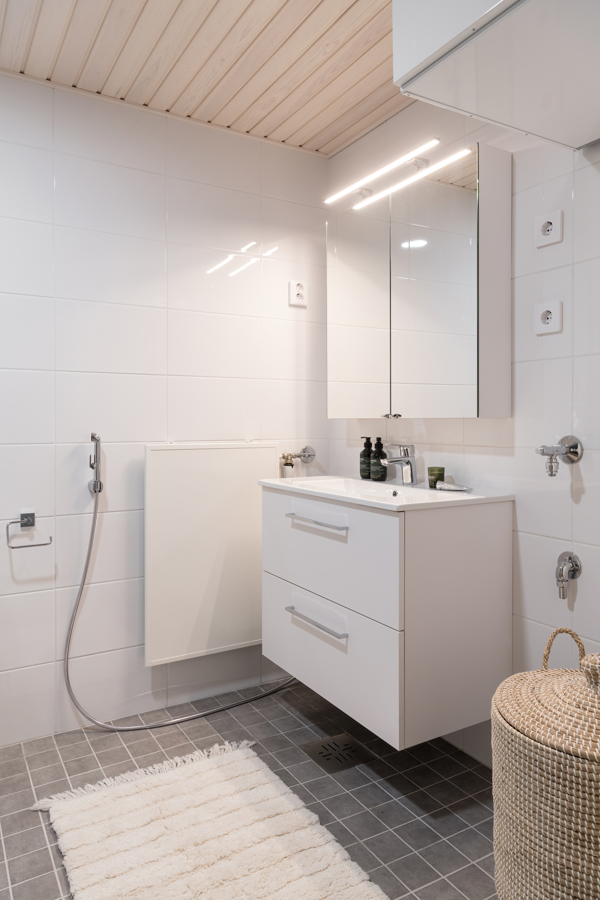 Kylpyhuoneen laatat ovat Laattapisteen Neutro-mallistoa sisustustyylien mukaisesti. Kylpyhuoneen seinät ovat valkoista matta- tai kiiltävää laattaa. Kalusteet ovat Laattapisteeltä. Katto on valkolakattua puupaneelia.