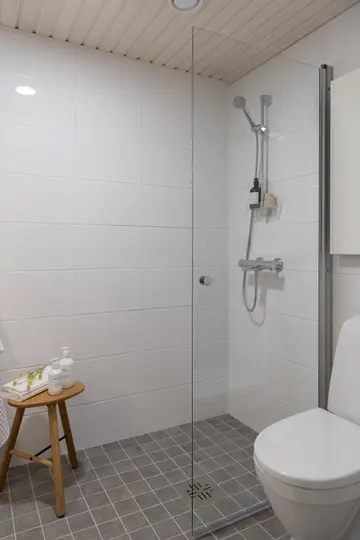 Kylpyhuoneen laatat ovat Laattapisteen Neutro-mallistoa sisustustyylien mukaisesti. Kylpyhuoneen seinät ovat valkoista matta- tai kiiltävää laattaa. Kalusteet ovat Laattapisteeltä. Katto on valkolakattua puupaneelia.