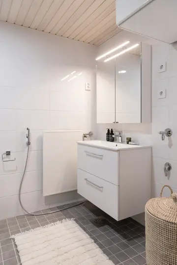 Kylpyhuoneen laatat ovat Laattapisteen Neutro-mallistoa sisustustyylien mukaisesti. Kylpyhuoneen seinät ovat valkoista matta- tai kiiltävää laattaa. Kalusteet ovat Laattapisteeltä. Katto on valkolakattua puupaneelia.