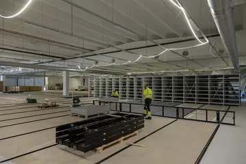 ”Alkuvuosi oli kriittisten työvaiheiden aikaa. Saimme tiukasta aikataulusta huolimatta sekä toisen kerroksen talotekniikan että lattiatyöt valmiiksi niin, että hyllyasennukset päästiin aloittamaan suunnitelman mukaan toukokuun vaihteessa. Nyt käynnissä ovat ensimmäisen kerroksen talotekniikkatyöt, ja toimisto-osan alakattotyöt on tarkoitus aloittaa kesäkuun alussa. Tällä hetkellä työskentelemme 40 rakentajan vahvuudella”, kertoo SRV:n työmaapäällikkö Miika Mikkola.