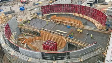 Työmaalla näkyivät syksyllä huomiota herättävästi isot muottirakenteet. Isot muotit ovat nyt pääosin poistuneet, kun uuteen pysäköintihalliin johtavan ajorampin seinävalut ovat lähes valmiit.